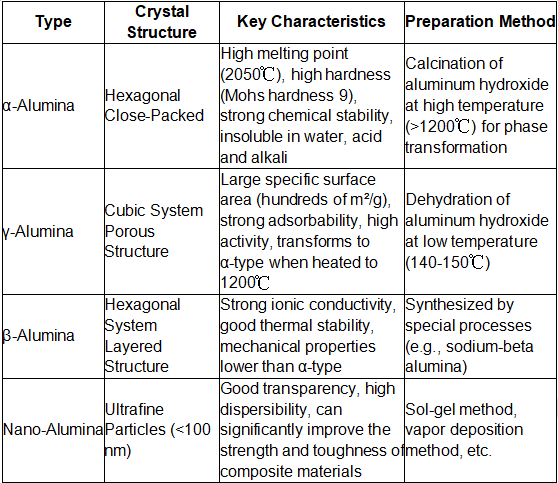 Osnovna klasifikacija prahu aluminijevega oksida temelji na njegovi kristalni strukturi in postopku priprave. Pogoste vrste in njihove značilnosti so naslednje: